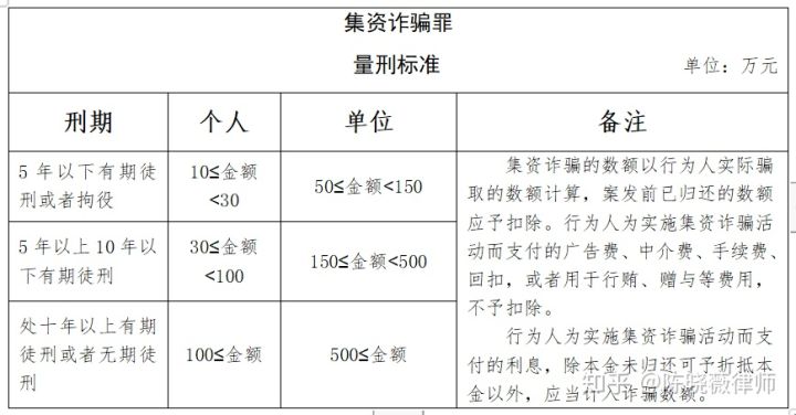 集资诈骗罪个人犯罪起刑金额为10万。单位犯罪的起刑金额为50万。