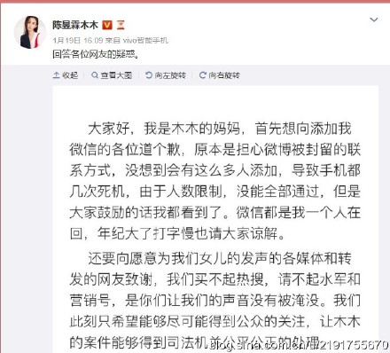 19日下午,陈昱霖母亲再次就此事发表声明,回应网友疑惑。